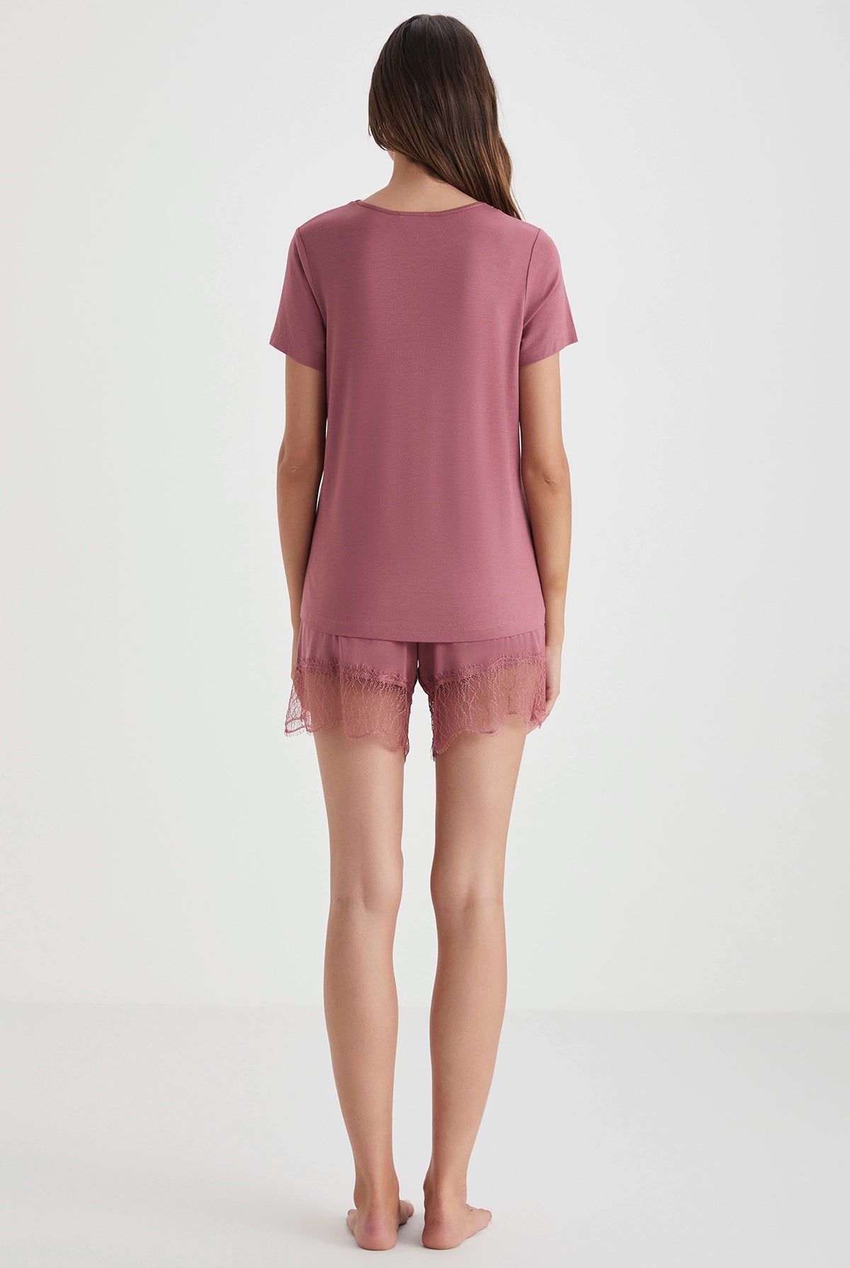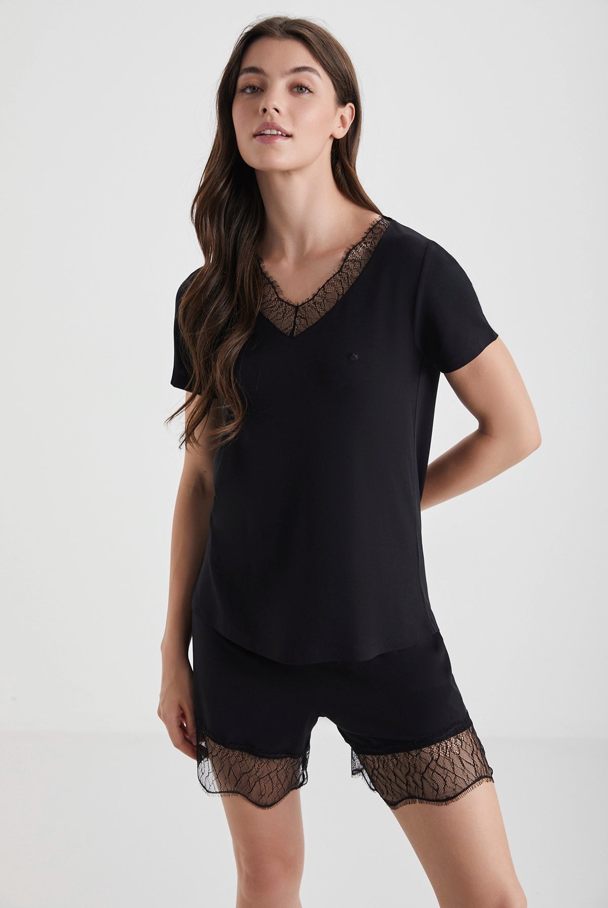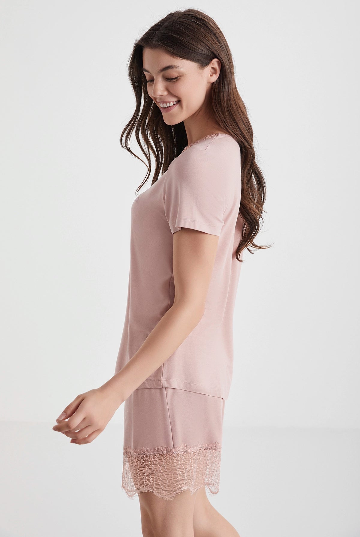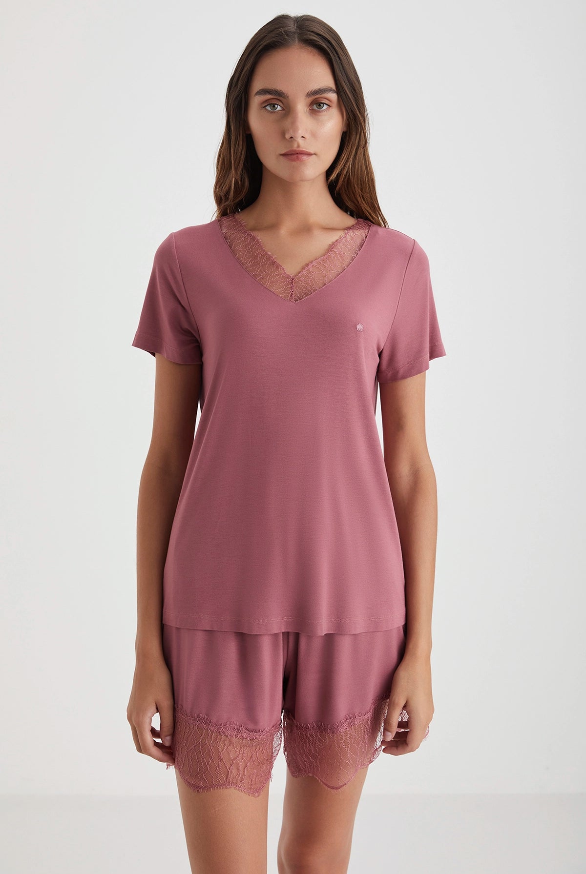 Pamuklu modeller, doğallığı ve terletmeyen yapısıyla yaz aylarının vazgeçilmezi olurken; modal kumaşlar yumuşak dokusuyla ciltle uyum içinde çalışır. Daha zarif bir görünüm arayanlar için saten şortlu takımlar, parlak dokusu ve kaygan yapısıyla hem estetik hem de feminen bir seçenek sunar. Romantik bir tarzdan hoşlananlar için dantel detaylı modeller öne çıkarken, daha sade ve modern çizgiler arayanlara çizgili, geometrik ya da minimal desenli alternatifler sunulmaktadır.