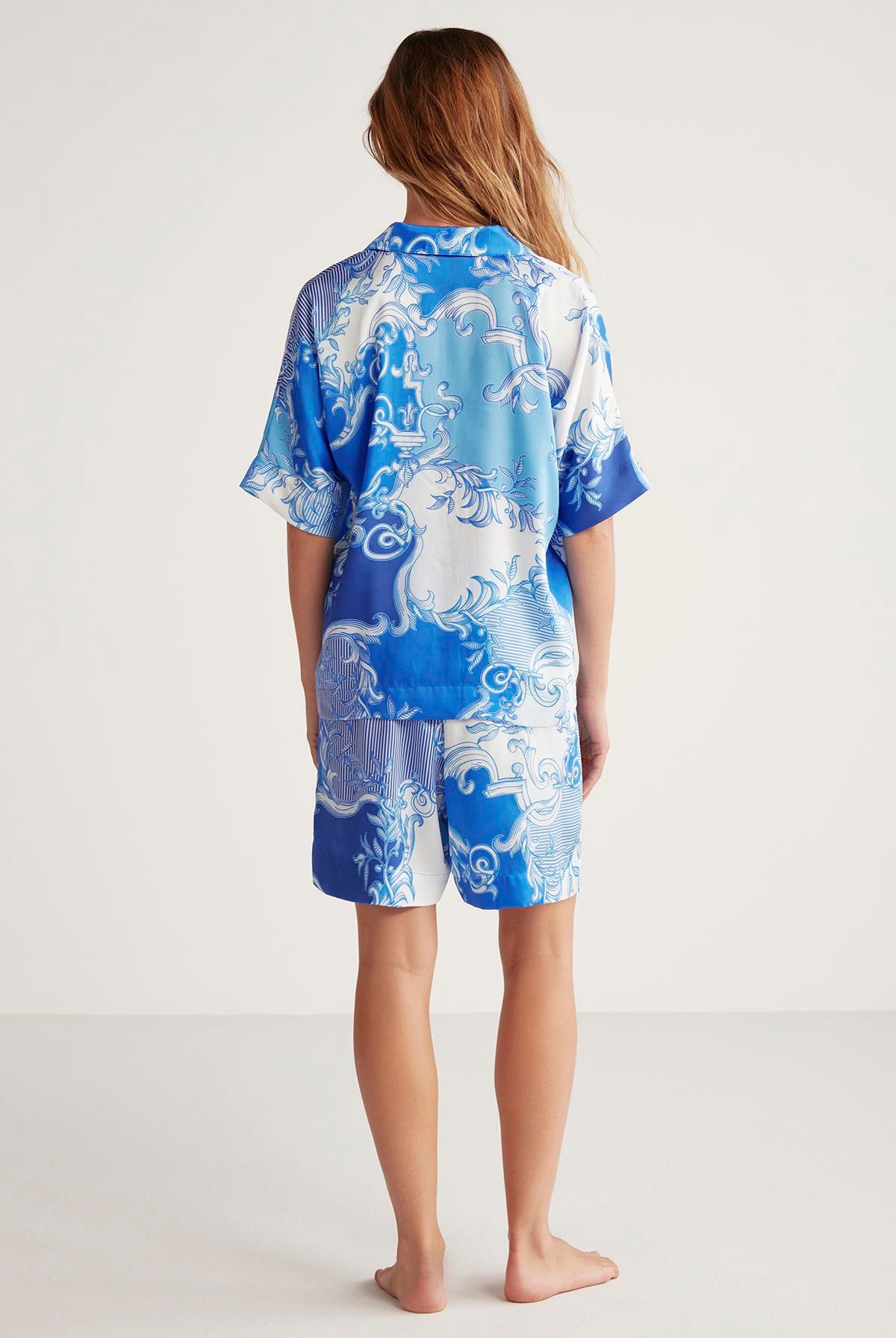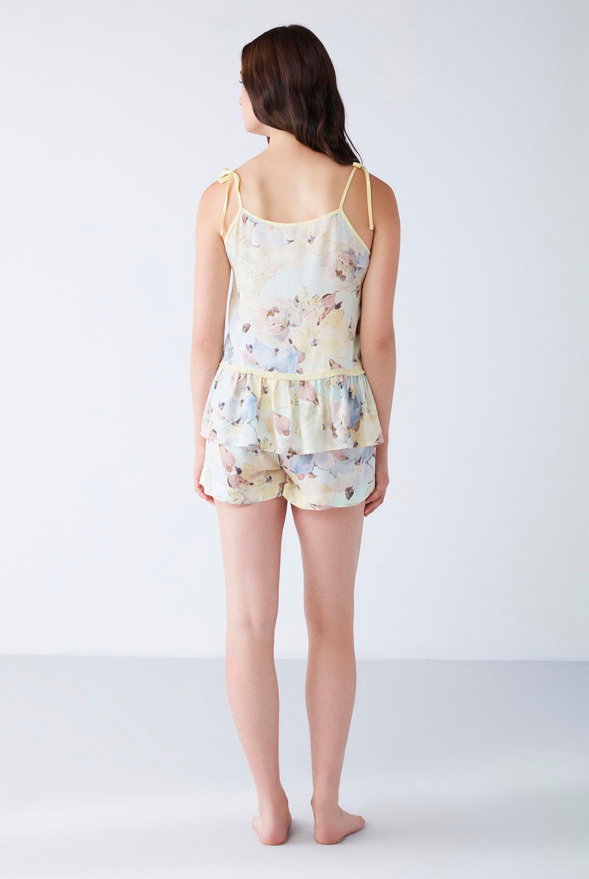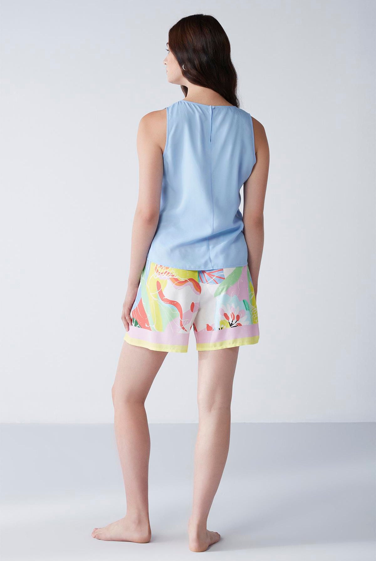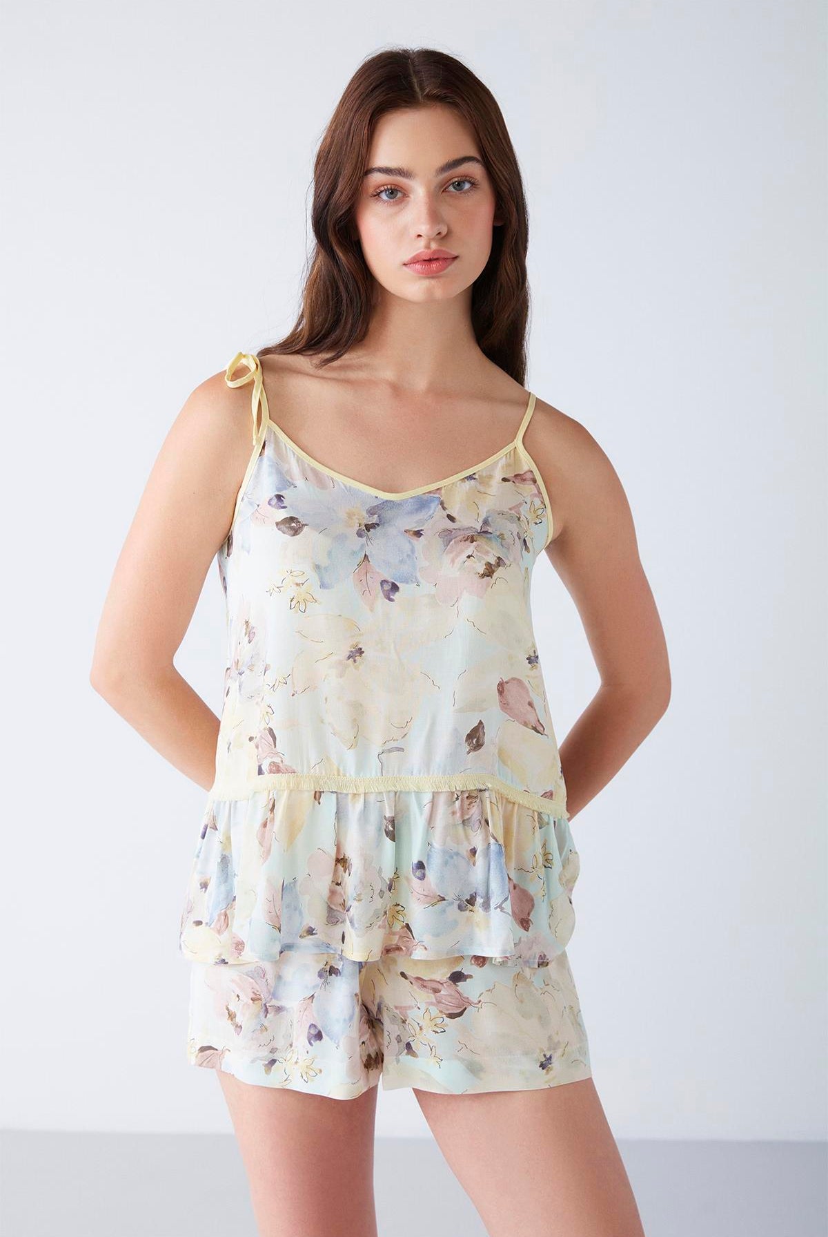 Saten şortlu pijama takımları, zarif ve şık bir dokusu vardır, vücuda yumuşakça oturur ve hafif serinlik hissi verir.