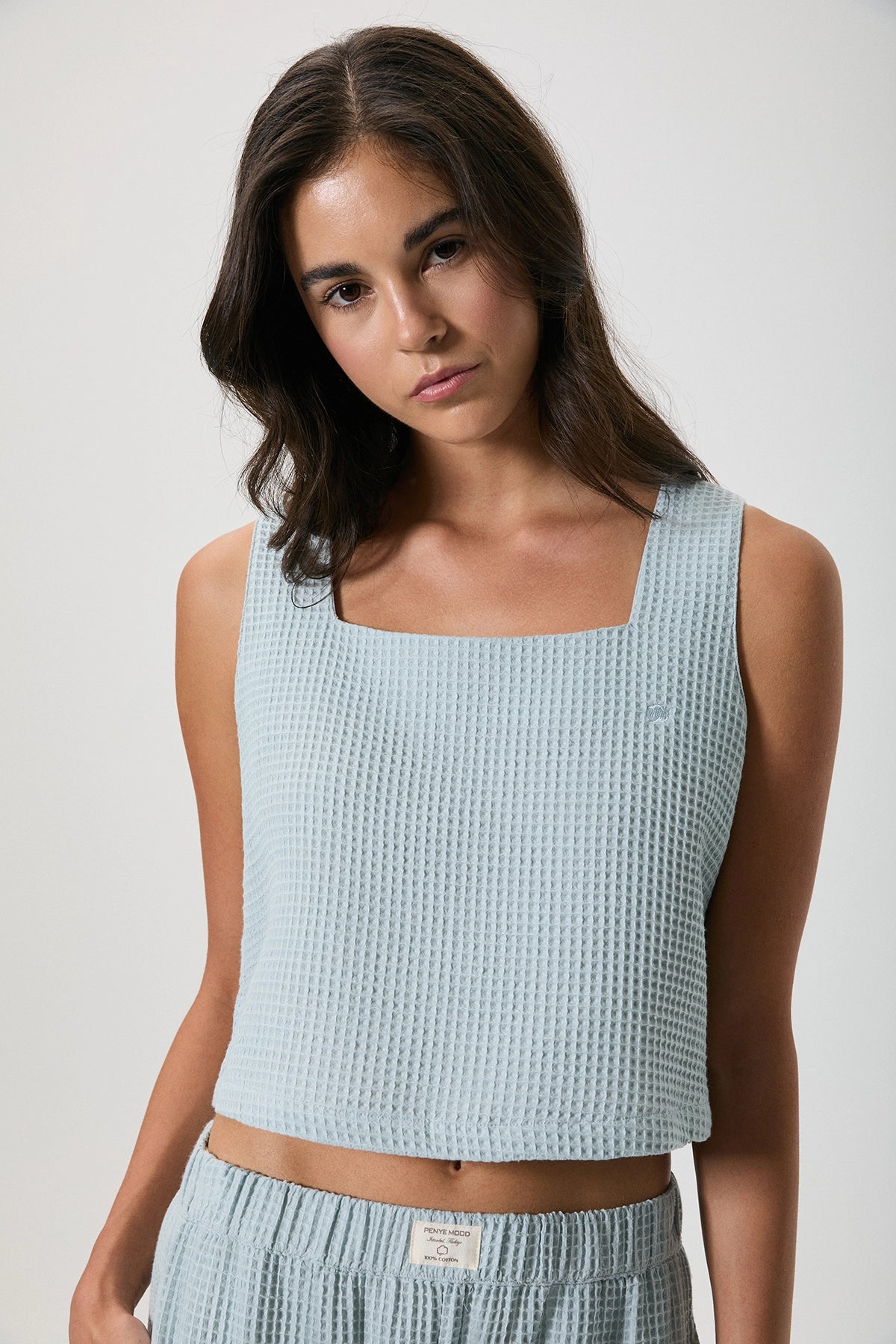 Üst: Waffle dokulu görünüm, rahat kesim, gün boyu konfor